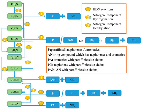 In the HCR model, the reaction network is extremely complicated with 177 reactions. According to reference [24], the reactions can be grouped into six types: (1) paraffin hydrocracking; (2) ring-opening; (3) dealkylation of aromatics, naphthenes, nitrogen lumps, and sulfur lumps; (4) saturation of aromatics, non-basic nitrogen lumps, and hindered sulfur lumps; (5) hydrodesulfurization (HDS) of unhindered sulfur lumps; and (6) hydrodenitrogenation (HDN) of nitrogen lumps. Each reaction rate equation is based on the classical theory of Langmuir–Hinshelwood–Hougen–Watson (LHHW) [25], which demonstrates that the heterogeneous catalytic reactions undergo three basic stages: adsorption, surface reaction, and desorption. Figure 3 illustrates the part of the reaction network employed in the HCR model of Aspen HYSYS for the reaction of nitrogen lumps.