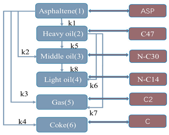 Since the constants of LHHW in Equations (1) and (2) ascertained by basic research are scarcely found, general kinetic reactions are applied to describe the reaction network of petroleum based on the Arrhenius equation. And researchers have different opinions about the order of the reactions [27,28]. In this paper, it is presumed that the whole reaction pathway consists of first-order reactions. In addition, due to the low gas yield of the entire reaction system, the volume of the reaction system is assumed to be immutable.