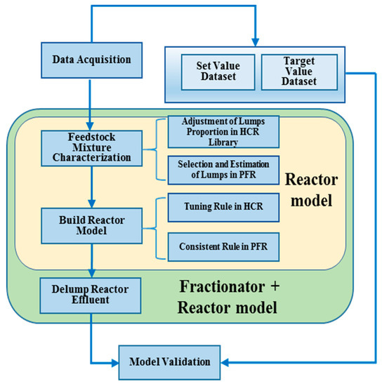 The workflow for developing an integrated residue hydrogenation model is shown in Figure 5 with the Aspen HYSYS/Refining simulation software. A similar workflow for the hydrocracking process was proposed in [24]. However, it is different for the heavy petroleum refining process.
