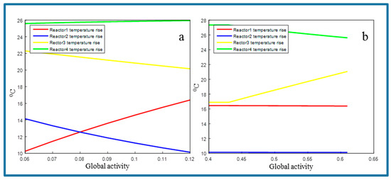 Four reactor temperature rises with global activity of different reactors: (a) reactor 1; (b) reactor 3.