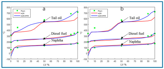 Predictions of the ASTM D86 distillation curves of liquid products with the HCR model and HCR + PFR model: (a) Dataset 1; (b) Dataset 3.