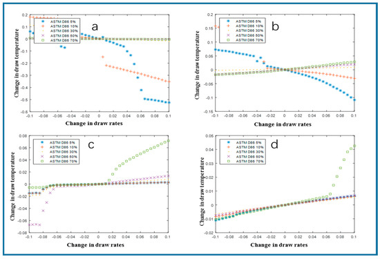 Sensitivity results of the side draw rate and ASTM D86 curve change of different products and methods: (a) naphtha with the HCRSRK method; (b) naphtha with the data-based delumping method; (c) diesel with the HCRSRK method; (d) diesel with the data-based delumping method.