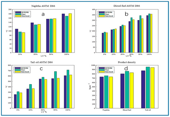 The experiments of Figure 12 are performed with the feed of fractionator from a HCR since the added ashphaltene lump is out of the range of the HCRSRK. Figure 12 shows the simulation accuracy comparison of products properties, including the distillation curve and standard gravity with these two methods. Figure 12a,d show that the data-based method has better prediction for the distillation range of naphtha, diesel fuel and the standard density of the products. For the distillation curve of tail oil, the two methods have almost the same prediction. The detailed average relative deviations (ARD) of distillation with the HCRSRK and data-based method are 5.59% and 2.56% for naphtha, respectively; they are 6.48% and 3.61% for diesel fuel, respectively; and they are 16.41%, 13.19% for tail oil, respectively. The deficiency of the higher boiling point RA accounts for large ARD of tail oil. Meanwhile, the average relative deviations (ARD) of density of three products are 6.4% and 2.8% with the HCRSRK and data-based method. The lumps with the data-based method, which possesses more number and better distillation properties account for the higher accuracy.