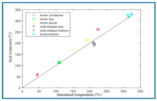 To assess the performance of the simulated fractionator, temperature profile, product yields, distillation curves, and density of liquid products are important indicators for model evaluation. Temperature distribution is meaningful for evaluating energy consumption, which is also important to energy optimization and product cutting for engineers. Figure 15 shows the prediction of the temperature distribution of the column. The Pearson coefficients of the temperature distribution are 0.977, 0.985, 0.987, 0.983, 0.985 for dataset 1 to 5, respectively. Apparently, the model demonstrates good capability in predicting column temperature distribution.