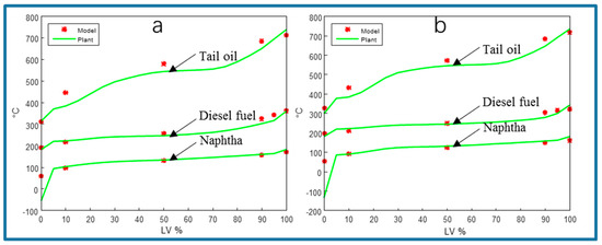 Predictions of ASTM D86 distillation curves of liquid products: (a) Dataset 1; (b) Dataset 2.