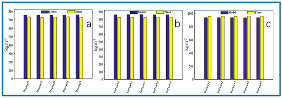 Predictions of the density of products: (a) naphtha; (b) diesel fuel; (c) tail oil.