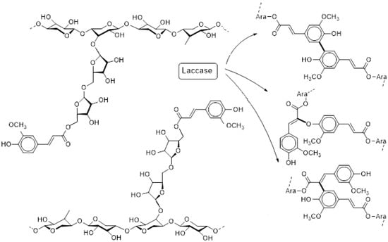 - Martínez-López, A.L.; Carvajal-Millan, E.; Marquez-Escalante, J.; Campa-Mada, A.C.; Rascón-Chu, A.; López-Franco, Y.L.; Lizardi-Mendoza, J. Enzymatic cross-linking of ferulated arabinoxylan: Effect of laccase or peroxidase catalysis on the gel characteristics. Food Sci. Biotechnol. 2019, 28, 311–318. [Google Scholar] [CrossRef]