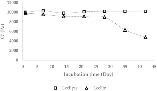 Gels formed using laccase Ppu showed a tanδ ≤ 0.5 after 28 days of storage. Although an increase in loss factor was observed after day 35 (tanδ ≤ 0.9), the storage modulus remained constant (Figure 3).