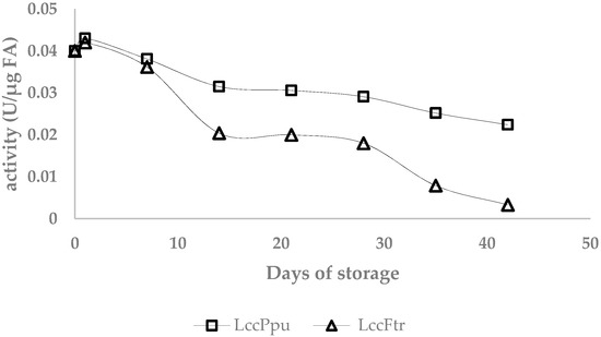 The storage stability of the enzymatically cross-linked AX gels (6%) was investigated over six weeks at 25 °C. Besides, the residual activity of the laccases Ppu, Ftr, and C was determined. The storage modulus of the AX gels with laccase C showed a substantial decrease from 9.35 to 2.65 kPa after two weeks of storage. The storage moduli of the AX gels with laccase Ppu and Ftr are shown in Figure 3 over 42 days of storage. Gels formed with laccase Ftr showed a decreasing G′ after 28 days. By the end of day 35, the storage modulus reached around 6.32 kPa and lost its viscoelastic properties as reflected by a high loss modulus of 8.45 kPa (G″ ˃ G′). AX gels formed with LccFtr reached a loss factor of 4.23 on day 42.