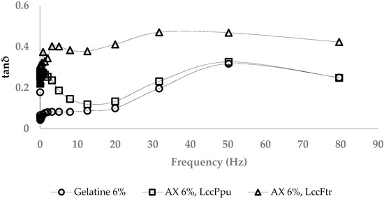 The viscoelastic properties of AX (6%) and gelatin gels (6%) were analyzed by a frequency sweep test at ω = 10 rad/s (Figure 5). Storage and loss modulus of the gelatin gel were 9.75 and 2.24 kPa, respectively; the loss factor was <0.3. At frequencies lower than 50 Hz, the loss factors of 6% AX gels formed using laccase Ppu were slightly higher than for gelatin gels. This difference was more significant with laccase Ftr, which obtained loss factors < 0.5. The storage moduli of AX gels and gelatin were on the same level (data not shown). They all showed loss factors < 1, which confirmed their elastic properties.