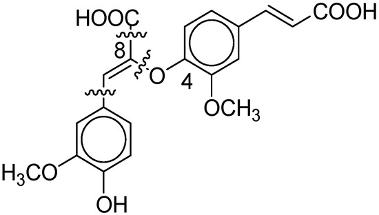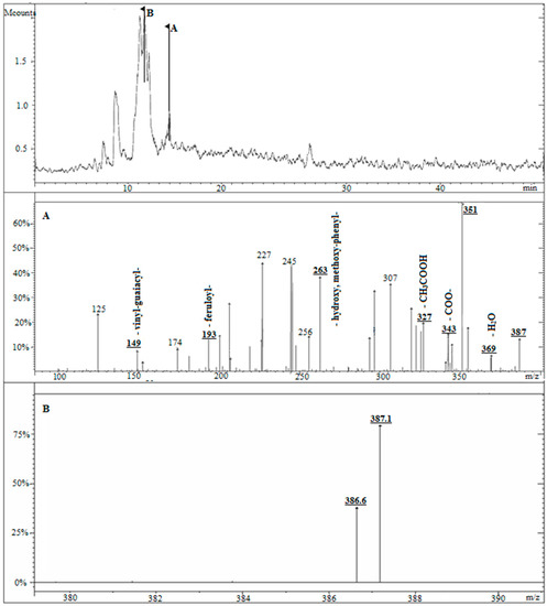 In addition, a big peak at a retention time of about 11 min with 386.6 and 387.1 m/z ions showed a clusteration. The difference of 0.5 amu between the detected masses means that an ion possessing a double charge was present. This is interpreted as a clustered diferulate of as of now unknown structure. Recently, formation of cross-links of ferulic acid of higher molecular masses than dimers and undefined superior structures was reported [32].