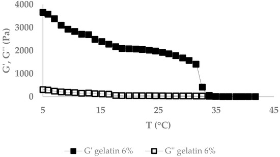The melting point, water holding capacity, and swelling ratio were determined to investigate physical properties of the gels. Analyzing the melting point of gelatin gels showed a drop in storage modulus at almost 35 °C, followed by a G″ overtaking G′ (Figure 8). AX gels gradually decreased in G′, and G′ stayed greater than G″ during the heating process (Figure 9). The higher temperature stability of the AX gel must be attributed to the covalent bonds formed after oxidative coupling of the ferulic acids [32].
