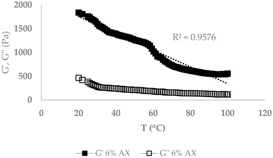 The melting point of AX (formed with LccPpu) and gelatin gels was measured by a constant frequency oscillatory test. Figure 8 and Figure 9 present the temperature dependence of dynamic modulus (G′ and G″) during isochronal temperature sweeps in heating from 5 to 42 °C and 20 to 100 °C for gelatin and AX gels, respectively. The starting temperature was chosen according to the gel formation temperature. Gelatin gel showed a high storage modulus during heating from 5 to almost 30 °C followed by a sudden drop at around 32 °C. The melting point of gelatin depends on its grade and concentration, but is typically ≤ 35 °C [26]. As shown in Figure 9, there was a gradual decrease of the storage modulus with increasing temperatures in AX gels, which presented a linear correlation between rising temperature and falling storage modulus with R2 = 0.96.