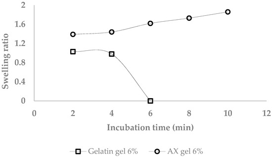 Estimated swelling ratio of the AX gel (in water and for 36 h incubation at room temperature) was higher than theoretically determined from the diferulic acid content of AX gels. It was suggested that in addition to di-FA and tri-FA, higher ferulated cross-linking and physical entanglements would contribute to the final arabinoxylan gel structure [9]. In contrast, the hydrogen bonds of the gelatin gel were dissolved by the penetrating water molecules after five minutes storage at room temperature.