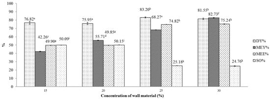 The effect of maltodextrin: gum Arabic mixture (4:1) concentration on DY, MEY, MEE and SO is displayed as in Figure 3. At first glance, these results are similar to those in the former investigation, except for results of DY, where a positive relationship between concentration and DY was observed. In this investigation, the concentration of the wall material mixture of 30% seemed to induce the highest DY, MEE and MEY, attaining 82.75 ± 2.06, 80.74 ± 0.003 and 76.24 ± 0.18, respectively.