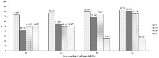 Effect of maltodextrin:gum Arabic mixture (4:1) concentration on various indicators of the microencapsulation process. Figures with same letters indicate statistical indifference.