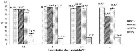 Figure 4 displays the influence of the essential oil concentration on several indicator of the spray drying process, including DY, MEY, MEE and SO. One-way ANOVA revealed that concentration of core material exerted significant effects (p < 0.05) on the MEY, MEE and SO index of the encapsulated powder. Overall, the MEE and DY index showed an increasing trend with the concentration of essential oils which ranged from 0.5% to 2%. However, there was no difference observed between MEE values attained at 1%, 1.5% and 2% concentration and between DY values attained at 1.5% and 2% concentration. For MEY, the indicator peaked at the oil concentration of 1.5%, reaching 89.31% and decreased thereafter to 66.56% when rising the concentration to 2%. This trend is in line with the study of Hogan et al. where a sharp decline in MEE from 89.2% to 18.8% was observed when increasing the soy oil/sodium caseinate ratio from 0.25 to 3.0 [30]. The current peak MEY is higher than a previously reported MEY (81.2%) [15], which was obtained using a combination of gum Arabic and modified starch as wall materials. The current results suggest that the core material concentration of 1.5% gave the optimal DY, MEY and MEE. The reduction in MEE in the current study is explained by the removal of hydroxyl groups (-OH) from hydrophobic compounds, such as citral, from the linkage network of maltodextrin under an excessive high concentration of essential oils [31].