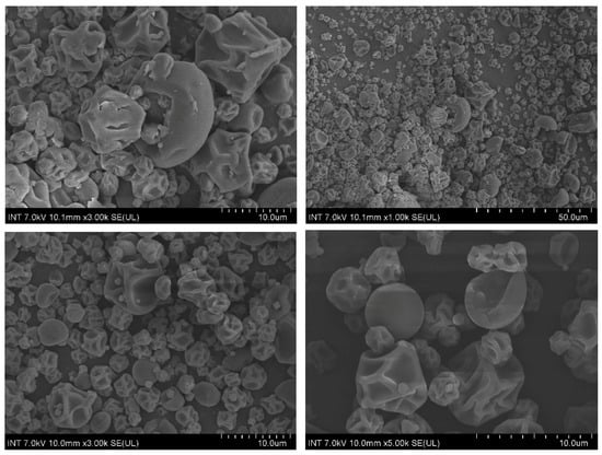 Figure 5 illustrates the SEM microphotograph of microcapsulates fabricated at 140 °C with an oil concentration of 1.5% (w/w) and a maltodextrin concentration of 30% (w/w). The particles exhibited a relatively uniform morphology and no apparent fissures or cracks were found, suggesting good core retention and protection of capsulates. Regarding particle shape, under current drying temperature, most of the obtained particles were predominantly spherical with external surface being shriveled and concave, which is indicative of low drying temperatures and better protection of core material [33,34]. However, there exist some particles with a smooth and hard crust. This is possibly due to faster evaporation.