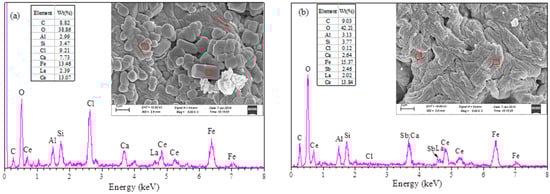 SEM images of SAB before and after Sb (III) adsorption are shown in Figure 1. Before adsorption, SAB was mainly granular with a smooth surface (Figure 1a). Also, as shown in Figure 1a, some cross-linking is visible and porosity is high, which indicates that Fe3O4@HCO adsorbent was encapsulated in sodium alginate network [15]. At the same time, the X-ray analysis (EDS) (Figure 1a) showed that the main elements of SAB were O (38.86%), Ce (13.07%), Fe (13.46%), C (8.82%) and Cl (9.21%), implying that the chemical compositions of this adsorbent iron oxides and cesium oxides. The surface morphology of SAB adsorbed Sb (III) changed to some extent, and the surface was rough and the porosity was reduced (Figure 1b). EDS spectra show that the weight percentage of Sb increases to 2.46%, which indicates that Sb is adsorbed by SAB [33].