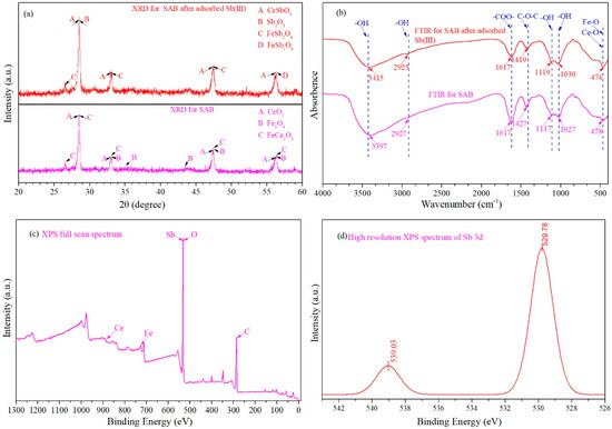XPS, as we know, can measure the composition of the residual products after SAB has adsorbed Sb (III) [15,20]. As shown in Figure 2c, full scan spectra show that Ce, Fe, Sb, O and C are present in the remaining products, indicating that Sb is adsorbed by SAB. To learn more about the electronic states of the Sb (III) element, high resolution spectral analysis of Sb was also carried out (Figure 2d). The binding energies of Sb (3d5/2) and Sb (3d3/2) detected by XPS were 529.78 and 539.03 eV, respectively. According to the chemical state database of XPS, the residual product has Sb (V) on the surface, and the original water solution used in the experiment was Sb (III) solution. This indicates that there was redox reaction in the process of adsorption, which is basically consistent with the results of Qi [20].