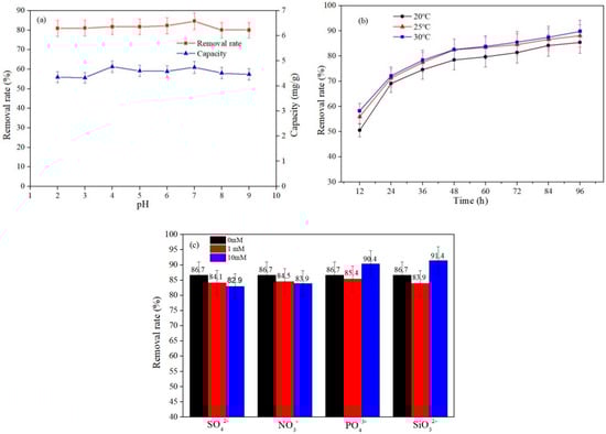 Considering the existence of ions in antimony-containing wastewater, we investigated the effect of some coexisting ions (NO3−, SO42−, PO43−, SiO32−) on the adsorption of Sb (III) by SAB, as indicated in Figure 3c. The results show that the added anions, including NO3− and SO42−, have no significant effect on Sb (III) sequestration. This could be because that the interaction between NO3− and SO42− with SAB is mainly through outer complexation, and thus, the effect on the adsorption of Sb (III) is not significant [6,40]. Together, 1 mM PO43− and 1 mM SiO32− inhibited the adsorption of Sb (III) by SAB, but again, the effect was not great. This may be because low the concentrations of PO43− and SiO32− can compete with Sb (III) for the sites of SAB through specific adsorption. In contrast, 10 mM PO43− and 10 mM SiO32− resulted in a small enhancement on the adsorption of Sb (III) by SAB. For PO43−, this may be because the higher concentration of Na3PO4 solution can dissolve SAB microspheres [41], resulting in the increase of contact area between SAB and Sb (III), promoting the adsorption of Sb (III) to a certain extent. However the promotion mechanism of SiO32− on the adsorption of Sb (III) by SAB remains to be further studied.
