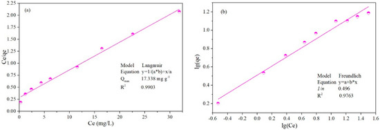 The effect of temperature on the Sb (III) removal rate is readily seen in Figure 3b. The removal efficiencies at 20 °C and 30 °C are 85.4% and 89.8%, respectively. The results show that with ascending temperature, the removal rate of Sb (III) increases, indicating that the adsorption of Sb (III) is an endothermic process in this adsorption system, consistent with previous study of the adsorption of metal ions by an iron matrix [33].
