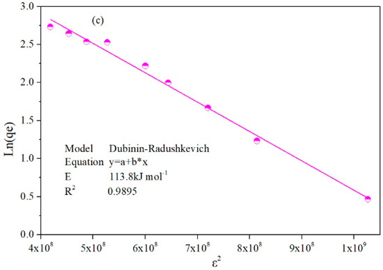 Isothermal adsorption models can provide information on adsorption mechanisms, surface properties and affinities of adsorbents [21,23,33]. In this research, the adsorption of Sb (III) solutions at different concentration was studied at pH 7, at 25 °C, over 144 h. To determine the mechanistic parameters related to Sb (III) adsorption, we used Langmuir model, Freundlich model and D-R model to study the relationship between Sb (III) adsorption in an aqueous solution and its residual amount in the adsorption process [15]. The equilibrium constants and correlation coefficients of adsorption isotherm model of SAB for Sb (III) are shown in Figure 4 and Table 2. The experimental results show that the adsorption data is a linear fit, and thus agrees well with Langmuir adsorption isotherm model (R2 > 0.99), indicating that the adsorption process of Sb (III) by SAB belongs to a single layer adsorption process, which is consistent with the conclusions of other researchers [20,21,33,42]. Additionally, the value for SAB was found to be 17.338 mg g−1, which was close to the experimental value (15.368 mg g−1), which demonstrated that it has good adsorption properties in comparison with other containing or iron loaded composite adsorbents, such as MnFe2O4 adsorption Sb (III) (10.66 mg g−1) [43] and nano FeOOH modified zeolite adsorption Sb (III) (7.17 mg g−1) [19]. The Freundlich adsorption isotherm model shows that Sb (III) is easily adsorbed by SAB (1/n < 0.5), which provides a good condition for adsorption [44]. The data of D-R adsorption isotherm model further indicated that the adsorption process belongs to chemical adsorption (E > 16 KJ/mol) [45].
