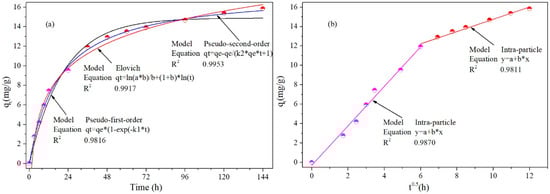 Adsorption kinetics of Sb (III) on SAB adsorbent: (a) pseudo-first-order kinetics, pseudo-second-order kinetics and Elovich kinetics, (b) intra-particle diffusion kinetics.
