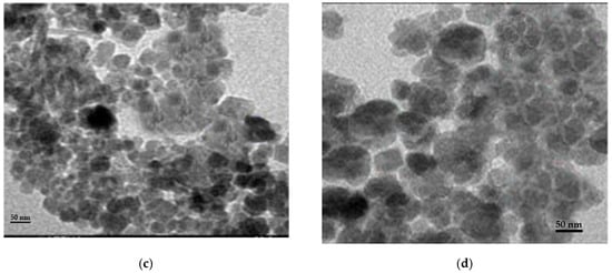 Different techniques for characterization including XRD, SEM, FT-IR, and TEM were used to identify chitosan, synthesized Fe3O4 nanoparticles, and synthesized Fe3O4/chitosan nanocomposite. SEM images of Fe3O4 and Fe3O4/chitosan nanoparticles are presented in Figure 1a,b, respectively. SEM showed a homogeneous distribution of Fe3O4 nanoparticles, which is related to the presence of chitosan offering high surface for the immobilization of the MnP enzyme. Furthermore, a spherical shape of iron oxide nanoparticles and a size less than 35 nm were determined from the SEM image. Based on the TEM images (Figure 1c,d for Fe3O4 and Fe3O4/chitosan, respectively), the prepared nanoparticles showed uniform spherical morphology with crystalline structure.