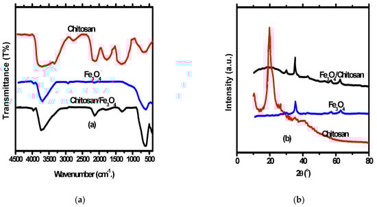 (a) FT-IR of chitosan, Fe3O4 nanoparticles and Fe3O4/chitosan nanocomposites; (b) XRD chitosan, Fe3O4 nanoparticles and Fe3O4/chitosan nanocomposites.