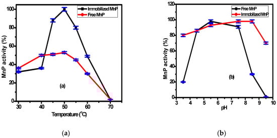 The immobilized MnP on the surface of Fe3O4/chitosan magnetic nanocomposite and the free MnP activities were examined at various temperatures and pHs. The working temperature ranged from 30 °C to 70 °C, while the working pH ranged from 3.5 to 9.5 as shown in Figure 3a,b, respectively. According to Figure 3a, the highest activity for both immobilized and free MnP was observed at 50 °C, with values two times higher for the immobilized enzyme (98 ± 2%). This is related to the higher stability of the immobilized enzyme compared with the free enzyme. Generally, the interaction between the support and the enzyme makes the immobilized enzyme resistant to temperature variation. The difference in activity between the immobilized and free enzymes was reported by many researchers [,]. According to Figure 3b, there is no significant difference between the immobilized and free MnP activity over the pH range (4.0–8.0). However, at pH = 8.5, there is a significant difference between the activity of the immobilized and the free MnP. These results might be related to the changes of enzyme conformation associated with the microenvironment change and the formation of covalent bonds upon immobilization. Consequently, the immobilization process makes the enzyme stable and resistant to pH change as reported by many researchers [,].