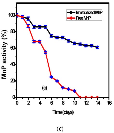 The effect of storage at 20 °C on the immobilized MnP on the surface of Fe3O4/chitosan magnetic nanocomposite and on free MnP activities was studied over two weeks (Figure 3c). According to Figure 3c, there is higher stability of the immobilized MnP compared to the free enzyme during the storage period. The free enzyme showed 45 ± 2% decrease of its activity during the first five days and 90 ± 2% decrease after ten days. However, the immobilized MnP showed a slight decrease of its activity reaching 60 ± 2% after 14 days. This behavior could be related to the presence of interactions between the enzyme and the nanocomposite support, which enhance the enzymatic stability compared to the free enzyme.