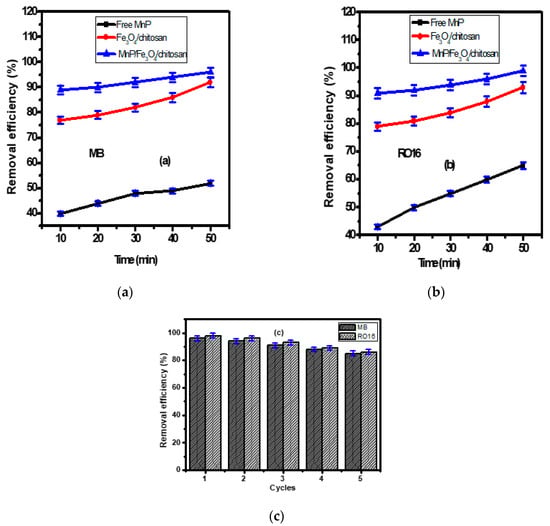 The removal efficiencies of MB and RO 16 dyes using the Fe3O4/chitosan nanocomposite, the free and the immobilized MnP enzyme on Fe3O4/chitosan nanocomposite are shown in Figure 4a,b. Experiments were conducted at 27 °C and pH 7, the values measured for the synthetic wastewater without any adjustment. Therefore, the operating conditions (27 °C and pH 7) that mimic the real environment are more logical for the application of the process at large scales. This could reduce the process cost at large scale. According to Figure 4a,b, free MnP allowed the removal of 40 ± 2% and 43 ± 2% of the MB and RO 16 after 10 min, respectively. After 50 min, the removal efficiency of MB and RO 16 reached 52 ± 2% and 65 ± 2%, respectively. The obtained results indicate the advantages offered by the enzyme for the removal of organic pollutants from wastewater. Generally, enzymes are characterized by a notable efficiency and substrate specificity. Ligninolytic enzymes, especially MnP, can degrade organic compounds, such as polyaromatic hydrocarbons, with high efficiency []. They act at different environmental conditions (pH, temperature, etc.), they are effective at low pollutant concentrations and they are not inhibited by xenobiotic and microbial inhibitors [,]. The results suggest that the problem associated with free enzymes can be reduced by the immobilization technology [,].