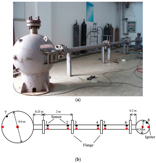 - Wang, Z.R.; Jiang, J.C.; Zhou, C. Experimental investigation of gas explosion characteristic in linked vessels. Explos Shock Wave 2011, 31, 69–74. (In Chinese) [Google Scholar]