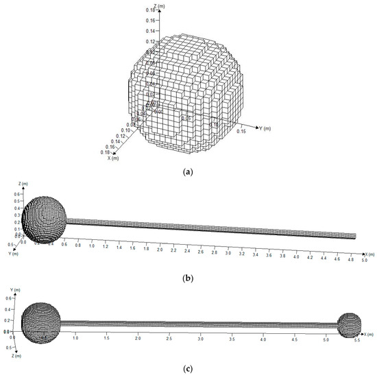 Two spherical vessels were fabricated from steel with a design pressure of 20 MPa and their internal diameters were 0.6 and 0.35 m (0.113 m3 and 0.022 m3 in volume, respectively). Seamless steel pipes, with an inner diameter and a thickness of 0.06 and 0.015 m, respectively, were connected using flanges and bolts. The pipes were divided into three parts (each part was 2 m in length), so that they could be combined into pipes with varied lengths of 2.45, 4.45, and 6.45 m between the big and small spherical vessels. Suitable monitor points were placed as dictated by the experiment. The entire explosion reactor with three different structures and the mesh are given in Figure 2.