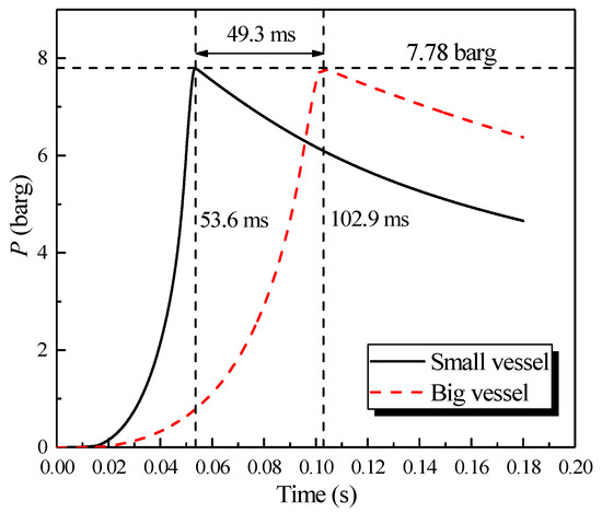 The results revealed that the pressure plots at the center of the spheres and the sensor on the sidewall could be superposed. As shown in Figure 3, a nearly consistent maximum explosion pressure can be observed in the big/small vessel, which were 7.78 and 7.79 barg, respectively. However, the maximum explosion pressure in two vessels peaked at 102.9 and 53.6 ms, respectively, and there was a considerable difference of 49.3 ms, where the amplitude can be attained to 48%. Therefore, the rate of pressure rise in the big vessel was lower than that of the small vessel. As a result, without changing the initial conditions of the scenario, the peak pressure was same, but by contrast, the rate of the pressure rise was only relevant to the vessel size. Additionally, this finding was consistent with the “explosion cubic law” [32].