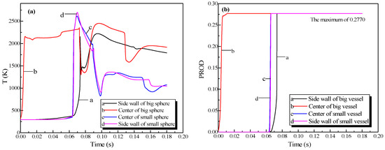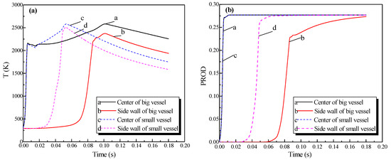 In Figure 11a, the explosion wave reached its highest temperature (2700 K) at 70 ms in the small vessel. By contrast, the temperature was 2400 K in the big vessel at the same time. Because of the oscillation of the combustion wave, the temperature at the center of the big vessel plummeted to 1300 K at 74 ms after the combustion wave spread into the small vessel, which then formed a second peak.