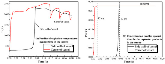 In virtue of the oscillation of the explosion, the plots of temperature displayed a fluctuation at the center of the vessel (in Figure 7a). Moreover, the energy was lost when the combustion wave contacted the sidewall. The highest temperature near the sidewall was low and the fluctuations were small comparatively. The plots in Figure 7b reveal that as the explosion wave spread, the entire vessel was filled with combustion products, which reflected that the variation of products was not be affected by the oscillation.