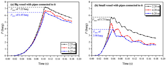 Figure 13a,b exhibited that the length of the pipe affected the pressure in the initiating vessel. The peak pressure in the initiating vessel was reached when the length of the connecting pipe was 4.45 m. As the length increased, the peak pressure in the initiating vessel increased, yet decreased when the pipe was longer than 4.45 m. The acceleration from the pipes on the combustion wave reinforced the explosion intensity, but as the length of the pipe increased, more energy was dissipated by the cause of the wall. When the length of the connecting pipe was excessive, a more momentous influence on the acceleration from the wall than that from the pipes could be demonstrated. Comparing Figure 13a together with Figure 13c,b together with Figure 13d revealed that the peak pressure in the initiating vessel was lower than that in the secondary vessel. Moreover, when the initiating vessel was the big vessel, the peak pressure in the second vessel was considerably higher.