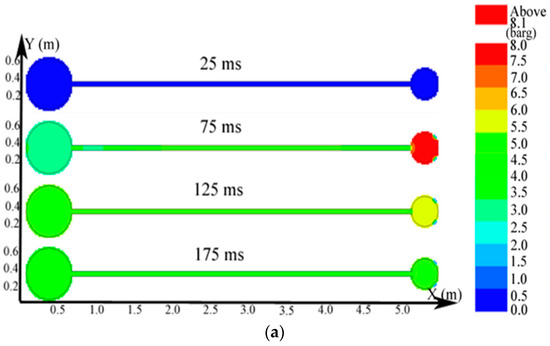 As illustrated in Figure 10a, the peak pressure was attained in the small vessel at 75 ms and was considerably higher than that in the big vessel. The temperature in the pipe was lower than that in the sphere because energy was absorbed by the wall in the long pipe in Figure 12b. Gas at a lower temperature was brought into the sphere as a result of the oscillation originated from the explosion wave. Here, the low-temperature jet cuts the temperature distribution in the sphere to a symmetrical structure.