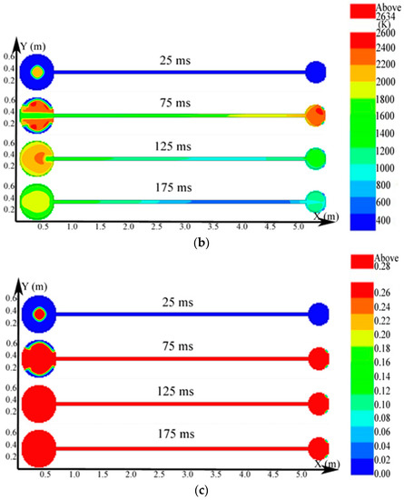 As evidenced in Figure 4a, the pressure in the larger vessel was practically uniform at any specific time. The explosion wave expanded into a spherical wave and the temperature was high near the igniter but gradually decreased until it approached the leading edge of the combustion wave in Figure 4b. Here, the combustion wave reached the sidewall at 125 ms. The temperature in the big vessel began to decrease when the explosion ended. As indicated in Figure 4c, when more natural gas participated in the reaction, the distribution of the explosion products spread further until the gas was consumed. The laws of the distribution of pressure, temperature, and explosion products in the small vessel were the same as those in the big vessel.