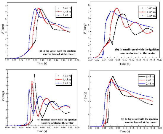 Considering the big vessel with the 4.45-m pipe and small vessel as an example, the ignition positions were the sidewall of the big vessel, the center of the big vessel, location 1, location 2, location 4, location 6, the center of the small vessel, and the sidewall of the small vessel, as depicted in Figure 2. A methane mixture with a concentration of 10 vol% was intentionally selected in the simulations. The plots of the explosion pressure in the large and small vessels are shown in Figure 12.