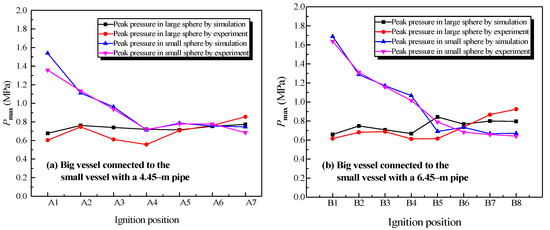The simulation results and experimental data were compared for two different structures, which were the big vessel connected to the small vessel with the 4.45-m pipe and the 6.45-m pipe. The peak pressure values at different ignition positions from the simulation and experiment are shown in Figure 14.