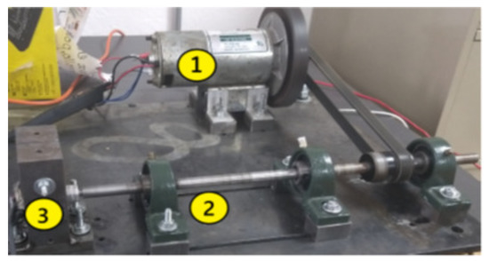 In the evaluation tests, the laboratory prototype shown in Figure 1 is used. This prototype consists of a DC motor available at the TecNM/CENIDET in Mexico (1) coupled to a bearing train (2), and an incremental encoder (3) through a band, whose mathematical model is presented in Equation (53). The results show the good performance of the interval observer in the event of an actuator fault.
