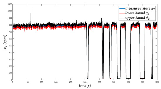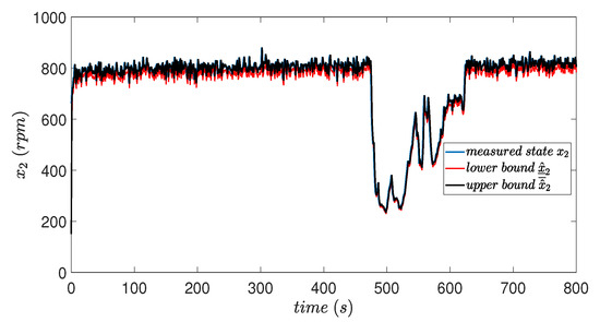 Figure 3 shows that the motor speed signal and the limits (upper and lower), estimated by the interval observer (18), present a fairly close dynamic behavior and the speed is always kept within the limits. When the fault disappears, the speed signal recovers its nominal value in approximately 120 s, with the dynamics of the motor coupled to a bearing train.
