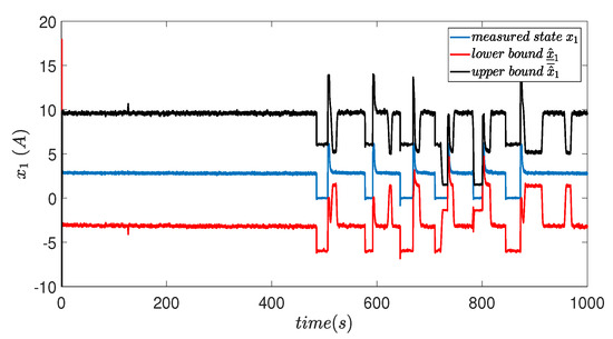 Figure 8 shows the dynamic behavior of the armature current signal. Figure 9 shows the variations of the motor rotational speed signal. The current signal and the speed signal, both measurable, are maintained within their respective estimated intervals, in the presence of a fault.