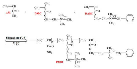 Firstly, a certain amount of AM, DMC, DABC, and deionized water were added to 150 mL quartz bottle, and the homogeneous solution was obtained by ultrasonic for 3 min. Secondly, 0.5 mol/L hydrochloric acid and sodium hydroxide were used to adjust the pH value of the above solution to a specific value. A predetermined amount of V-50 was added, and the solution was nitrogen-filled at room temperature for 20 min, and the reaction flask was capped. The solution was ultrasonicated at 35 °C for 25–35 min on an ultrasonic instrument (frequency, 45 KHz, KQ 2200E, Kunshan Ultrasonic Instrument Co., Ltd., Kunshan, China). Alcohol and acetone were used to purify the product, and the purified product was dried in a vacuum oven at 80 °C for 12 h, and after appropriate grinding, a powdery product PADD was obtained. Meanwhile, the preparation steps of PAM and PAD are same as those of PADD.