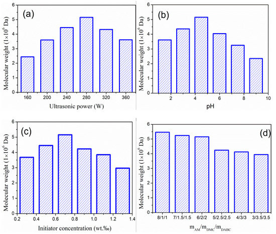Figure 2a explores the effect of ultrasonic power on the molecular weight of PADD. The other experimental conditions were fixed as follows: total monomer mass fraction 30 wt%, ultrasonic irradiation 30 min, pH 4.5, initiator V-50 mass fraction 0.07 wt%, cationic monomer AM:DMC:DABC mass ratio 6:2:2. As can be seen from Figure 2a, the molecular weight of polymer increases first and then decreases with the increase of power from 160 W to 360 W. Increasing the power of ultrasonic at the beginning can produce more free radicals, promote the reaction and increase the molecular weight of PADD. However, the molecular weight of PADD decreases with the increase of ultrasonic power over 280 W. This is mainly due to the excessive power of ultrasonic, which will induce the initiator to split in a short time and produce excessive free radicals, and can result in severe collision of monomers. As a result, it accelerates chain transfer and chain termination, and leads to the reduction of molecular weight [19]. Meanwhile, with the continuously increasing power of ultrasonic, the excessive temperature produced locally by the “hole effect” of ultrasonic will cause the breakage and degradation of the polymer main chain. At this time, the molecular weight of the polymer will decrease. Based on the above experimental results, the optimal ultrasonic power is 280 W.