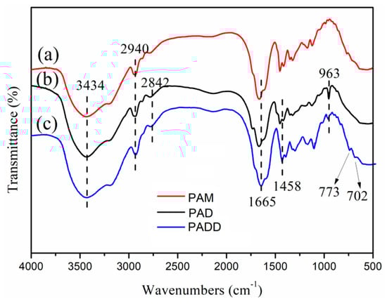 The FTIR of (a) PAM, (b) PAD, and (c) PADD.