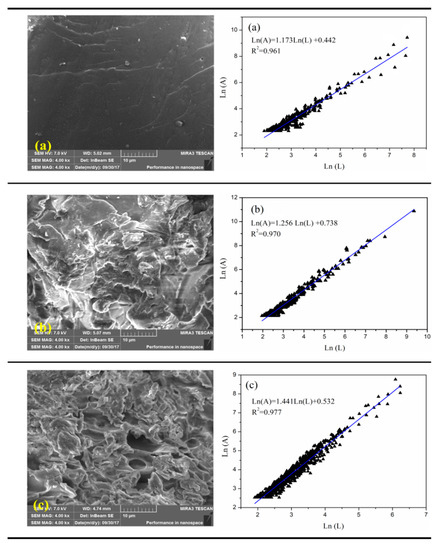 In Figure 5a, the surface of PAM is smooth, the structure is compact and the voids are few. This is mainly because the activity of AM is higher and homopolymerized of PAM with the lower polymerization activation energy. Thus, it is easier to generate a larger molecular weight, and the longer polymer chains are stacked and densely packed in space to possess a smooth and dense surface morphology [10]. However, when DMC grafted AM monomer, the surface morphology of PAD changed significantly. The PAD surface is rough uneven with few holes in Figure 5b. The introduction of DMC greatly increases the aperture and irregularity of PAD surface. The reason for this change is that the DAC is introduced into the AM chain, destroying the original structure of the PAM. In Figure 5c, it can be clearly seen that the surface of PADD is more disordered and irregular with many obvious holes. This is mainly due to the difference of physical and chemical properties between DMC, DABC, and AM, and the difference of molecular structure in space. After grafting DABC to PAD, the original ordered structure of PAD was destroyed, resulting in porous structure and rough surface morphology. In addition, the fractal dimension of the polymer surface is calculated by using Image-Pro Plus 6.0 software [33]. The results show that the fractal dimensions of PAM, PAD, and PADD are 1.173, 1.256, and 1.441, respectively. The surface fractal dimension of PADD is larger than that of PAM and PAD. PADD has higher hybrid and irregular surface morphology, which is conducive to contact with water molecules and maybe benefit for its solubility as well as improving the flocculation effect [22,25].